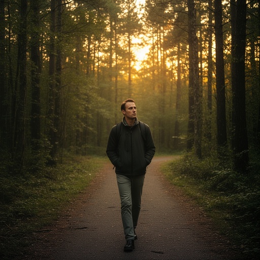 A man walking alone on a quiet forest path at golden hour, hands in pockets, reflective mood, cinematic, vertical 9:16, ...