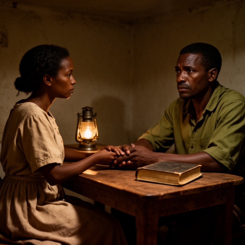 Prompt: Inside the same modest home at night, lit only by a small oil lantern on the wooden table, Miriam (same facial features, now wearing a simple beige house dress) sits across from her husband (mid-30s African man, short hair, calm but worried expression, wearing an olive green shirt). They hold hands across the table, serious conversation mood. A closed Bible lies beside the lantern. Warm low lighting, dramatic shadows, intimate emotional atmosphere, cinematic realism, shallow depth of field, 4k detail, consistent character faces.