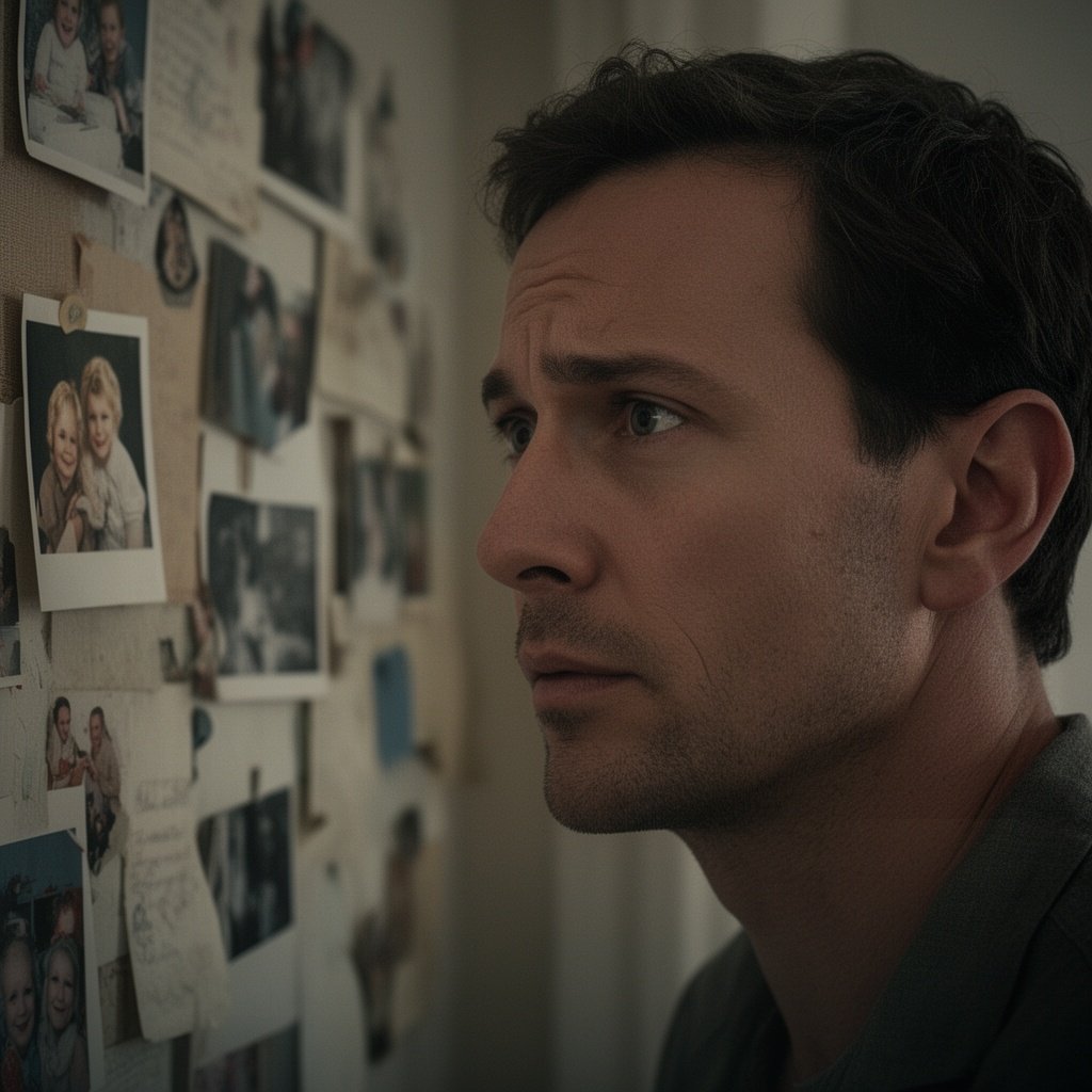 A man staring at photos and memories on the wall, emotional, nostalgic, cinematic lighting, realistic vertical portrait