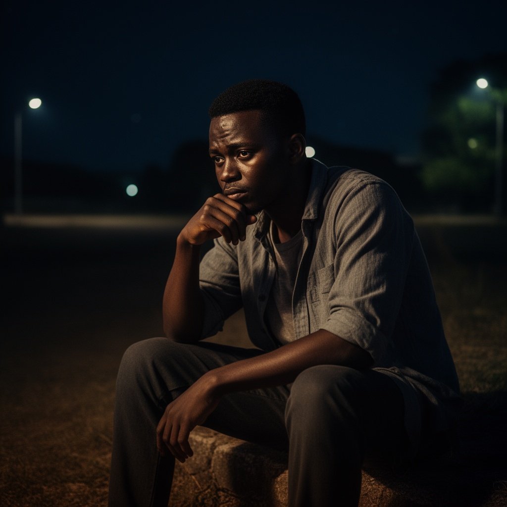 African young man sitting alone at night thinking deeply, emotional, cinematic lighting, realistic