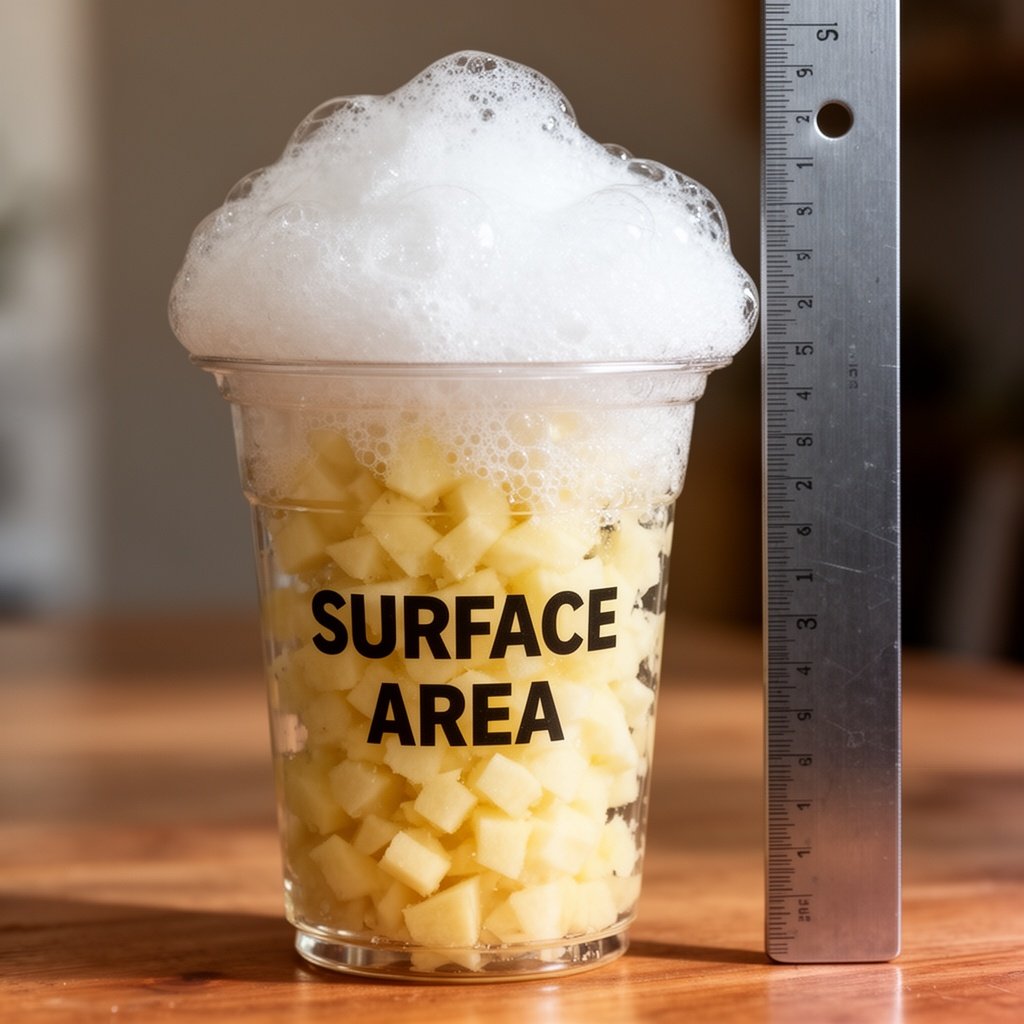 Clear cup labeled SURFACE AREA with finely chopped potato reacting with hydrogen peroxide, large amount of foam overflow...