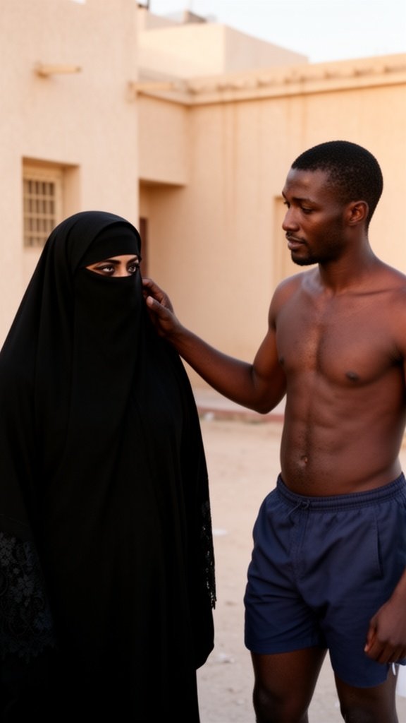 A veiled Saudi Arabian woman. A dark-skinned man wearing shorts stands beside her. He places his hand on her, and she lo...