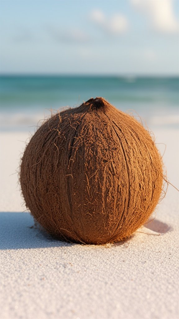 Cinematic close-up of a whole coconut resting on white sand, warm tropical sunlight, shallow depth of field, ocean softly blurred behind, ultra-realistic