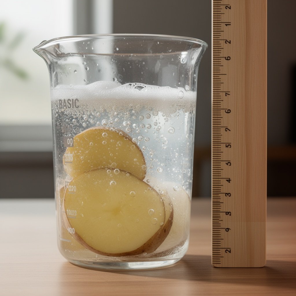 Clear cup labeled BASIC showing moderate bubbling reaction with potato and hydrogen peroxide, some foam present, ruler next to cup showing measurement, realistic, photorealistic, natural lighting